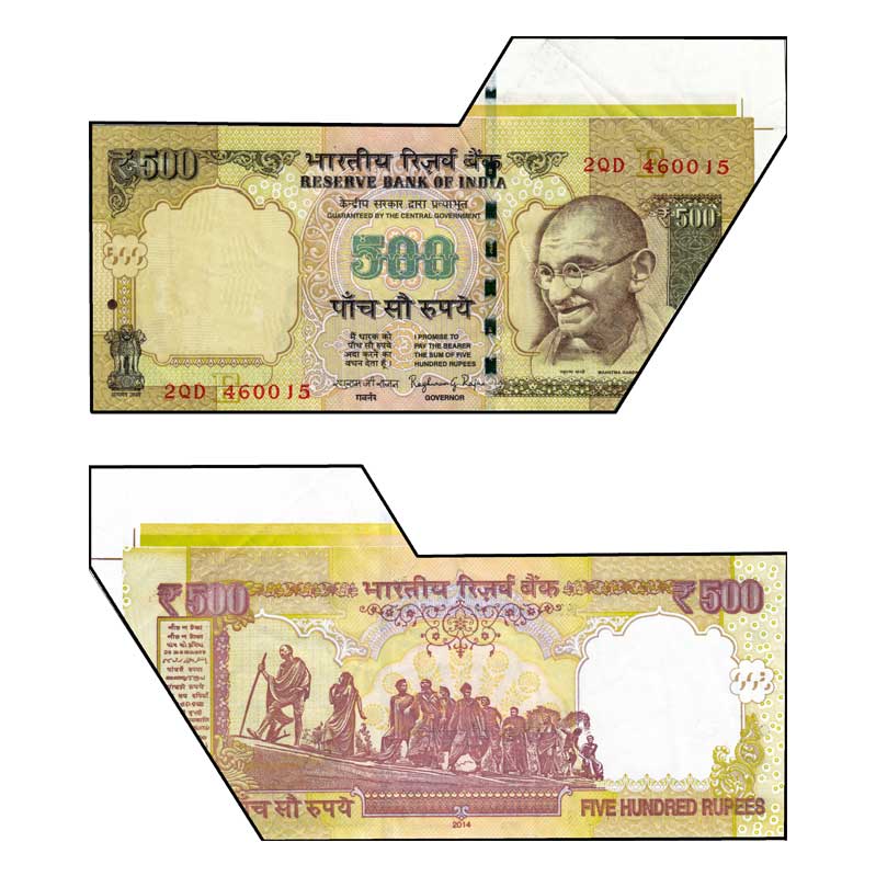 Republic of India, Error 500 Rupees, 2014 Signed by Raghuram G. Rajan, Inset E, Serial No 2QD 460015, Paper Fold Cutting Error,