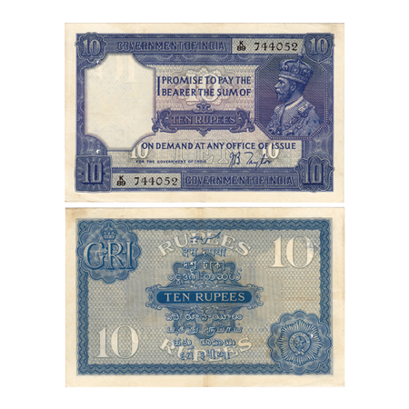 British India, George VI, 10 Rupees, ND (1944). Signed by C.D.Deshmukh, Serial No G17 090424 in green, rust pin hole. J&R 4.6.1.