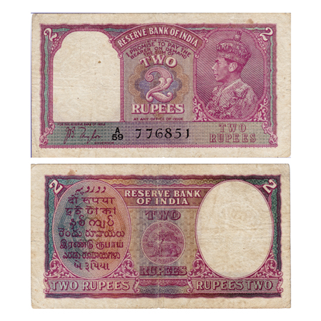 British India, George VI, 2 Rupees, ND (1943). Signed by J.B.Taylor, Serial No A59 776851 in black. J&R 4.2.1.