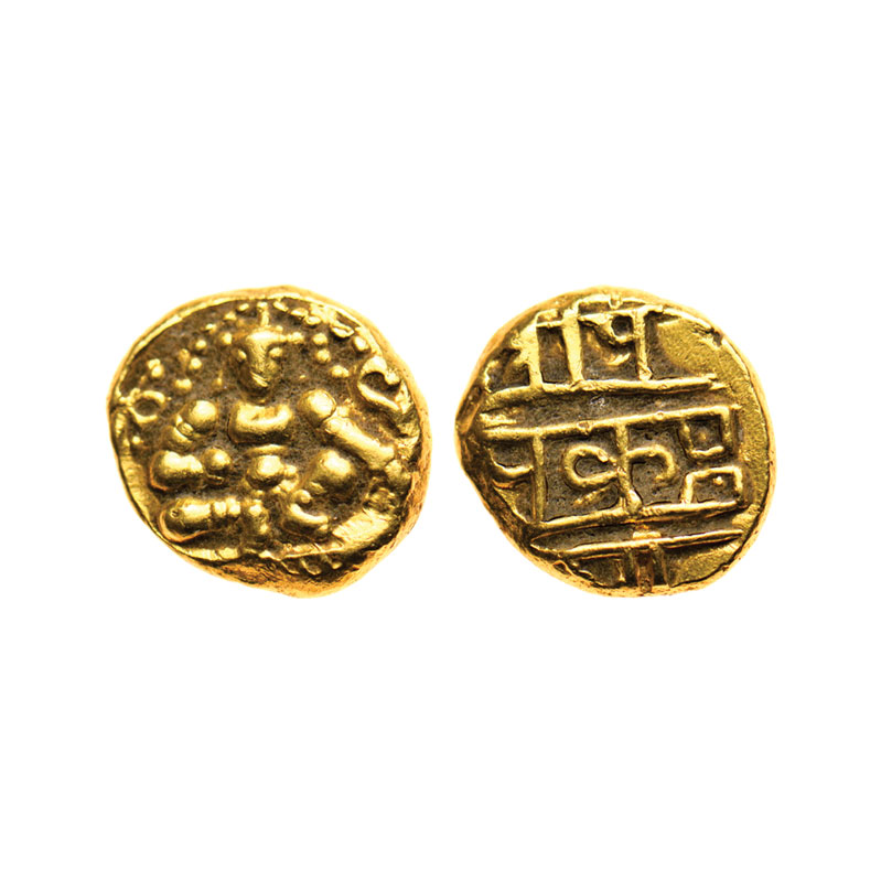 Nayakas of Chitradurga, Gold Durgi Pagoda, 3.87gm, Obv: Deity seated facing or Krishna as Bal Gopala, Rev: Nagari legend in three lines, 'Sri pra tapa krishna raya'. Mitch K&A # 882.