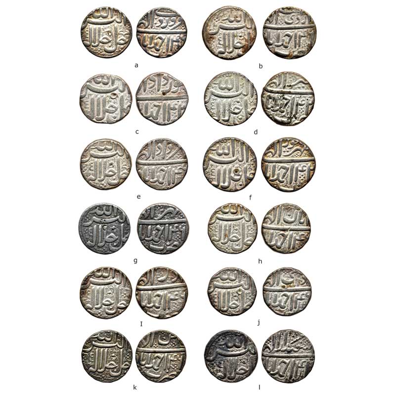 Akbar, Silver Rupee (12 coins set), Ahmadabad Mint, 12 months set, Illahi coins, Farwardin/RY46, Ardibihisht/RY46, Khurdad/RY42, Tir/RY42, Amardad/RY46, Shahrewar/RY42, Mihr/RY46, Aban/Ry46, Azar/RY46, Di/RY46, Bahman/RY46, Isfandarmuz/RY42. Andrew Liddle S 53.