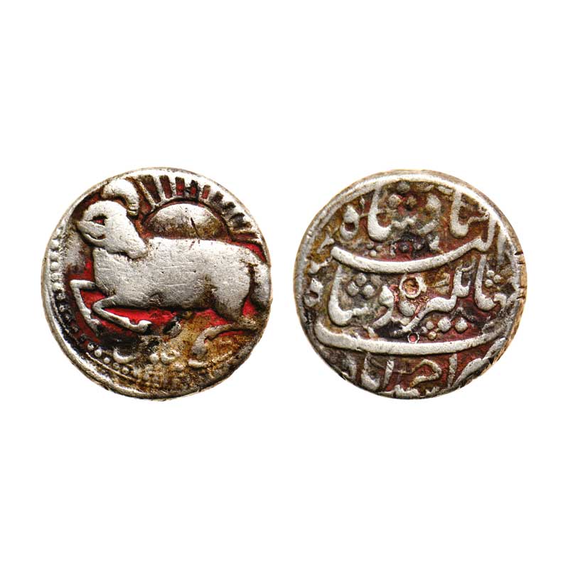 Jahangir, Silver Zodiac Rupee, 11.13gm, Ahmadabad Mint, Aries sign, AH 1027/13, Obv: A Ram emerging from the sun with the regnal year 13 at bottom, Rev: Zarb Ahmedabad , Jahangir Badshah Akbar Badshah, with the 1027 date at top, test mark on reverse. KM 150.2.