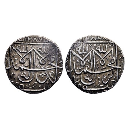 Bhopal, Silver Double Rupee, Shah Jahan Begam (AH 1285-1319/ 1868-1901 AD), AH 1286, both side Kalima & date. KM A14.