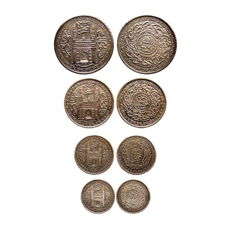 Hyderabad, A set of Silver (4 coins) Rupee, 8, 4 & 2 Annas, Mir Usman Ali Khan (AH 1329-1368/ 1911-1948 AD), Farkhanda Bunyad Hyderabad Mint, AH 1337/ RY8, 1342/13, 1348/19 & 1341/14, full 'Ain' in doorway of Charminar. KM Y 53a, 62, 61 & 60.