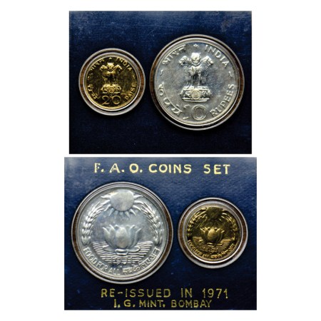 Republic of India, 1971, Food For All, UNC coin Set of 10 Rupee & 20 Paise, (F.A.O), Bombay Mint, in acrylic case, with Cover & certificate. RB 29.