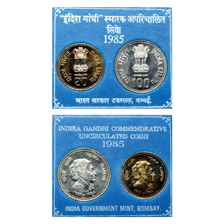 Republic of India, 1985, Indira Gandhi (1917-1984), UNC coin Set of 100 Rupee & 20 Rupee, Bombay Mint, with Cover & Certificate. RB 113.