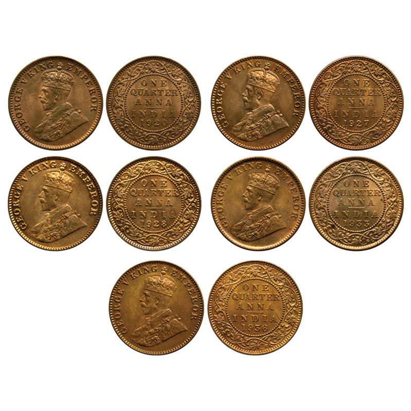 | George V, Copper Quarter Anna (5), 1920/1933/Calcutta Mint, 1927/1928/1936/Bombay Mint, F.Prid 665, 673, 680, 681,683. |