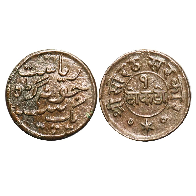 Junagadh, Copper Dokdo, 4.58g, Rasul Muhammad Khan (VS 1948-1968 / 1891-1911 AD), No date type, star at bottom. Type KM 46.1. Very Fine+, Scarce.