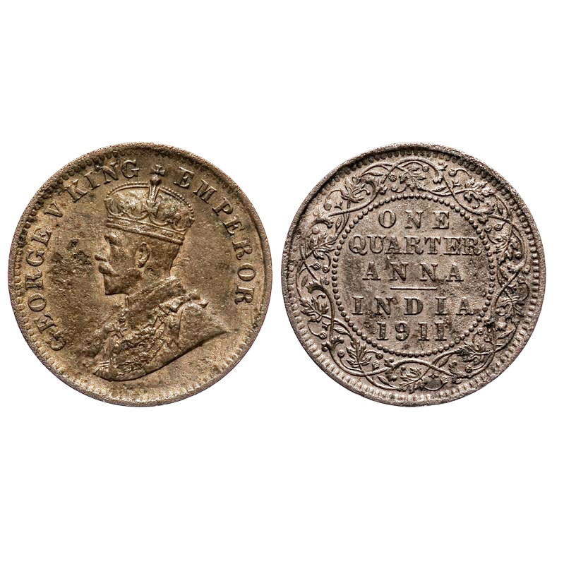George V, Bronze, Quarter Anna, 1911, Calcutta Mint, No dot, Pig type, Pitted on Obv and Rev. F. Prid 656. GK 1171. Very Fine+. Scarce.