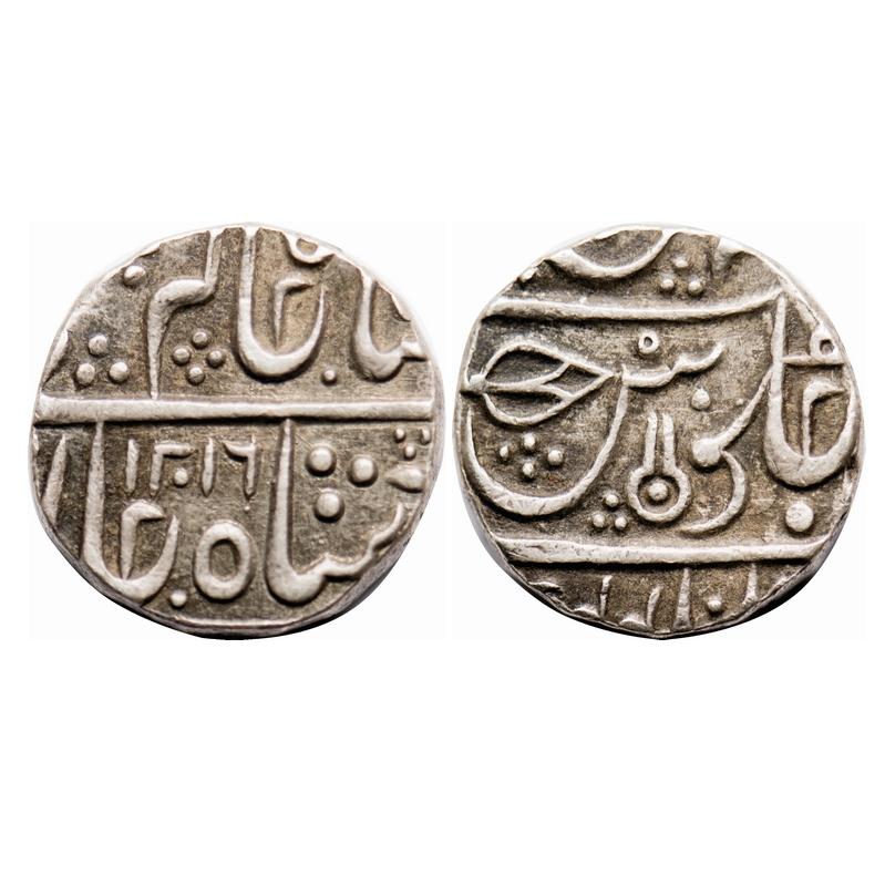 | Indore, Silver Rupee, 11.22g, Ahalya Bai (AH 1179-1210 / 1765-1795 AD), Malharnagar Mint, AH 1216, in the name of Shah Alam II, Leaf and shivalingam on reverse as mint marks. KM 58.2. Very Fine, Scarce. |