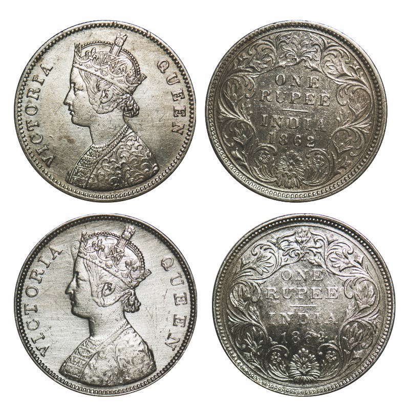 | Victoria Queen, Silver, Rupee, (2 Coins), 1862, 1) Calcutta Mint, A/I, With initial 'J', 2) Bombay Mint, B/II/2/0. F. Prid 66, 71. GK 255, 287. Very Fine + to About Extremely Fine. Scarce. |