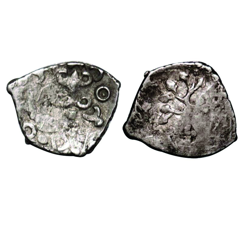 | Punch Marked, Saurashtra Janapada, (c. 400-300 BC), Silver ¼ Karshapana, 0.90g, 12.86 x 15.52mm, Obv: Bold srivatsa symbol around taurine and circles, Rev: Tree. Type 3.0 tree. About Very Fine, Scarce. |