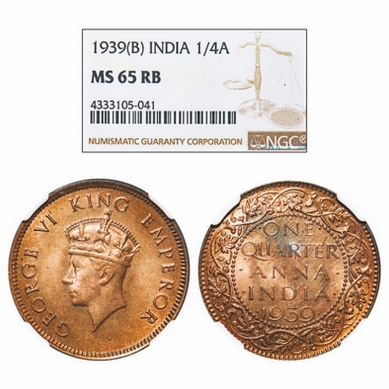 George VI, Bronze, Quarter Anna, 1939, Bombay Mint, Head Type I, Dot. GK 1422. NGC Slabbed MS 65 RB. Very scarce.
