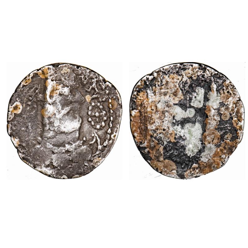 | Khingila, Silver Drachm, c. mid-5th century, 4.03g, 24.23X23.91mm, Crowned bust of king right, with crescent forehead ornament and hanging ribbon ends, lunar crescents on shoulders, "bull" tamgha at left, solar disc at right, Brahmi legend above left devashahi, right /Fire altar, flanked by armed attendants. Fine, Rare. |