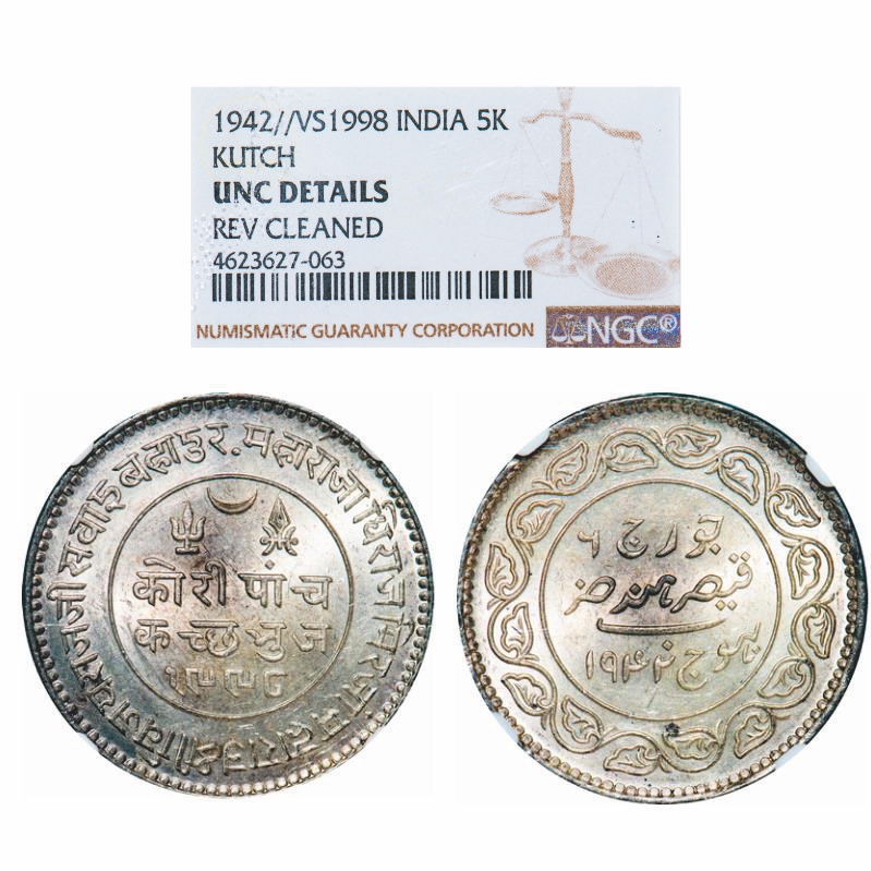 Kutch, Silver, 5 Kori, Khengarji III, INO George VI, VS 1998/1942 AD. Rajgor 271.1. NGC Slabbed UNC Details . Very Scarce.