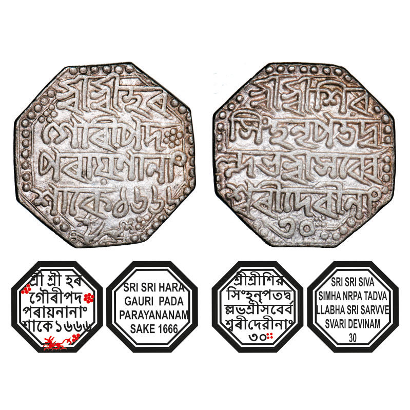| Assam, Octagonal Silver Rupee, 11.28g, Siva Simha citing Queen Sarvvesvari, Sk. 1666 year 30, Obv: in four lines: Sri Sri Hara/ Gauri Pada/ Parayananam/ Sake 1666, lion with tail down at bottom running left, Rev: in four lines: Sri Sri Siva/ Simha Nrpa Tadva/llabha Sri Sarvve/Svari Devinam/ 30. Reverse die perfectly struck at 6 o'clock. (A.Mitra. 144, RB. M15.1). Almost Uncirculated, Scarce. |