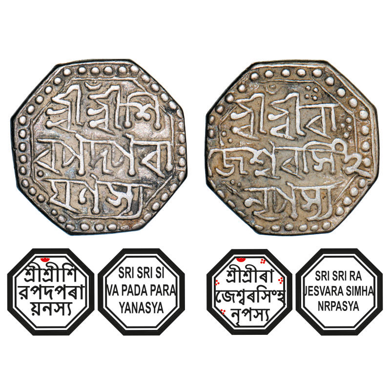 | Assam, Octagonal Silver Half Rupee, 5.67g, Rajesvara Simha (Siu-rem-pha) (1751-1769), Assamese legends in three lines, undated, Obv: Sri Sri Si/va Pada Para/yanasya, dot in crescent on upper center above first line, Rev: Sri Sri Ra/jesvara Simha/ Nrpasya. dot in crescent upper left above first line. Reverse die perfectly struck at 6 o'clock. (A.Mitra. 233, RB. O 55.9). Extremely Fine, Scarce. |