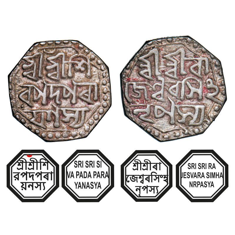 | Assam, Octagonal Silver Half Rupee, 5.62g, Rajesvara Simha (Siu-rem-pha) (1751-1769), Assamese legends in three lines, undated, Obv: Sri Sri Si/va Pada Para/yanasya, Crescent upper above first line. Rev: Sri Sri Ra/jesvara Simha/ Nrpasya. Reverse die perfectly struck at 6 o'clock. (A.Mitra. 233 die variety, RB. O 55.10). Very Fine+, Scarce. |