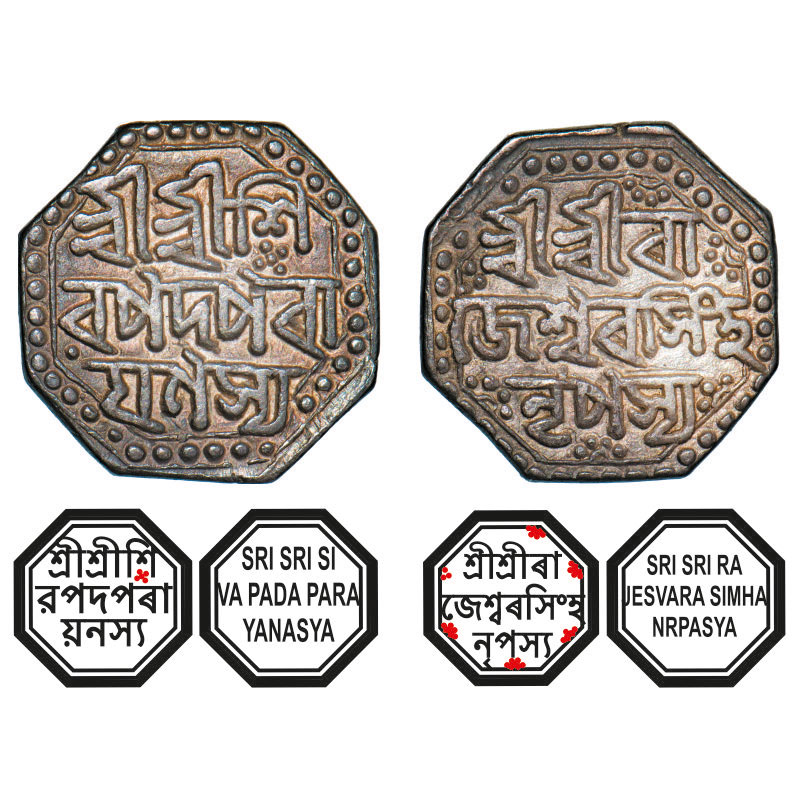 | Assam, Octagonal Silver Half Rupee, 5.63g, Rajesvara Simha (Siu-rem-pha) (1751-1769), Assamese legends in three lines, undated, Obv: Sri Sri Si/va Pada Para/yanasya, Rev: Sri Sri Ra/jesvara Simha/ Nrpasya. Reverse die perfectly struck at 6 o'clock. (A.Mitra. 233 die variety, RB. O 55.14). Toned Mint State, Scarce. |