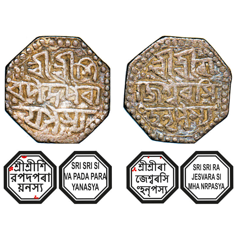 | Assam, Octagonal Silver Half Rupee, 5.19g, Rajesvara Simha (Siu-rem-pha) (1751-1769), Assamese legends in three lines, undated, Obv: Sri Sri Si/va Pada Para/yanasya, Rev: Sri Sri Ra/jesvara Si/ mha Nrpasya. Reverse die perfectly struck at 6 o'clock. (A.Mitra. 235A octagon die unlisted, RB. O 55. Unlisted). About Extremely Fine, Very Scarce. |