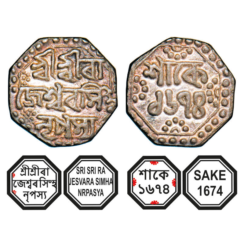 | Assam, Octagonal Silver Quarter Rupee, 2.82g, Rajesvara Simha (Siu-rem-pha) (1751-1769), Sk. 1674, Assamese legends in three lines, Obv: Sri Sri Ra/jesvara Simha/ Nrpasya, Rev: in two lines Sake/ 1674. Reverse die perfectly struck at 6 o'clock. (A.Mitra. 237, RB. O 57.2). Toned Mint State, Very Scarce. |