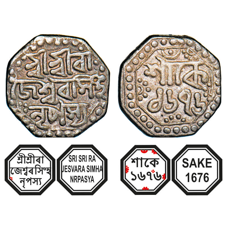 | Assam, Octagonal Silver Quarter Rupee, 2.84g, Rajesvara Simha (Siu-rem-pha) (1751-1769), Sk. 1676, Assamese legends in three lines, Obv: Sri Sri Ra/jesvara Simha/ Nrpasya, Rev: in two lines Sake/ 1676, dot within crescent on top left. Reverse die perfectly struck at 6 o'clock. (A.Mitra. 239A die variety, RB. O 59.2). Toned Extremely Fine+, Very Scarce. |