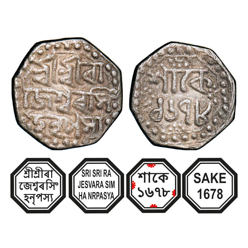 | Assam, Octagonal Silver Quarter Rupee, 2.60g, Rajesvara Simha (Siu-rem-pha) (1751-1769), Sk. 1678, Assamese legends in three lines, Obv: Sri Sri Ra/jesvara Sim/ha Nrpasya, Rev: in two lines Sake/ 1678. Reverse die perfectly struck at 6 o'clock. (A.Mitra. 241, RB. O 62.1). Very Fine+, Very Scarce. |