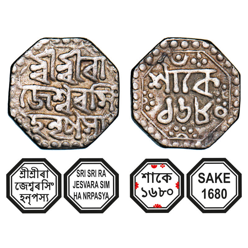 | Assam, Octagonal Silver Quarter Rupee, 2.81g, Rajesvara Simha (Siu-rem-pha) (1751-1769), Sk. 1680, Assamese legends in three lines, Obv: Sri Sri Ra/jesvara Sim/ha Nrpasya, Rev: in two lines Sake/ 1680, dot within crescent on top left. Reverse die perfectly struck at 6 o'clock. (A.Mitra. 243, RB. O 64.1). Toned Very Fine+, Very Scarce. |