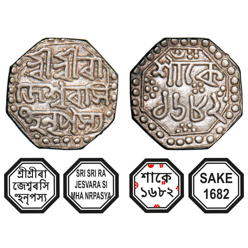 | Assam, Octagonal Silver Quarter Rupee, 2.81g, Rajesvara Simha (Siu-rem-pha) (1751-1769), Sk. 1682, Assamese legends in three lines, Obv: Sri Sri Ra/jesvara Si/mha Nrpasya, Rev: in two lines Sake/ 1682, dot within crescent on top left. Reverse die perfectly struck at 6 o'clock. (A.Mitra. 248, RB. O 67.2). Almost Mint State, Very Scarce. |