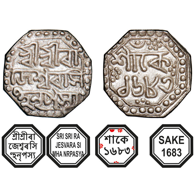 | Assam, Octagonal Silver Quarter Rupee, 2.81g, Rajesvara Simha (Siu-rem-pha) (1751-1769), Sk. 1683, Assamese legends in three lines, Obv: Sri Sri Ra/jesvara Si/mha Nrpasya, Rev: in two lines Sake/ 1683, dot within crescent on top left. Reverse die perfectly struck at 6 o'clock. (A.Mitra. 249, RB. O 68.1). Mint State, Very Scarce. |