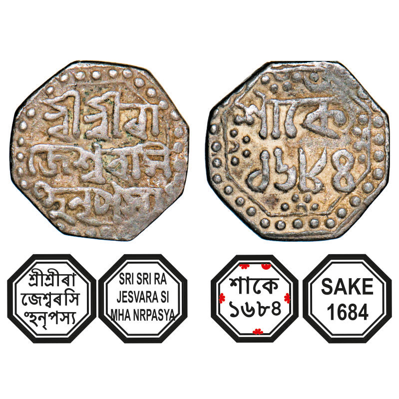 | Assam, Octagonal Silver Quarter Rupee, 2.80g, Rajesvara Simha (Siu-rem-pha) (1751-1769), Sk. 1684, Assamese legends in three lines, Obv: Sri Sri Ra/jesvara Si/mha Nrpasya, Rev: in two lines Sake/ 1684, dot within crescent on top right. Reverse die perfectly struck at 6 o'clock. (A.Mitra. 250, RB. O 69.1). About Very Fine, Very Scarce. |