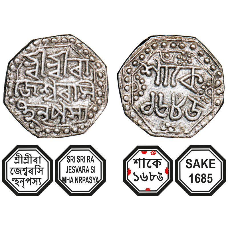 | Assam, Octagonal Silver Quarter Rupee, 2.75g, Rajesvara Simha (Siu-rem-pha) (1751-1769), Sk. 1685, Assamese legends in three lines, Obv: Sri Sri Ra/jesvara Si/mha Nrpasya, Rev: in two lines Sake/ 1685, dot within crescent on top left. Reverse die perfectly struck at 6 o'clock. (A.Mitra. 251, RB. O 70.2). Very Fine, Very Scarce. |