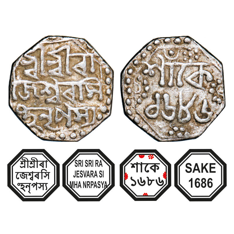 | Assam, Octagonal Silver Quarter Rupee, 2.82g, Rajesvara Simha (Siu-rem-pha) (1751-1769), Sk. 1686, Assamese legends in three lines, Obv: Sri Sri Ra/jesvara Si/mha Nrpasya, Rev: in two lines Sake/ 1686, dot within crescent on top left. Reverse die perfectly struck at 6 o'clock. (A.Mitra. 252, RB. O 71.1). Very Fine, Rare. |