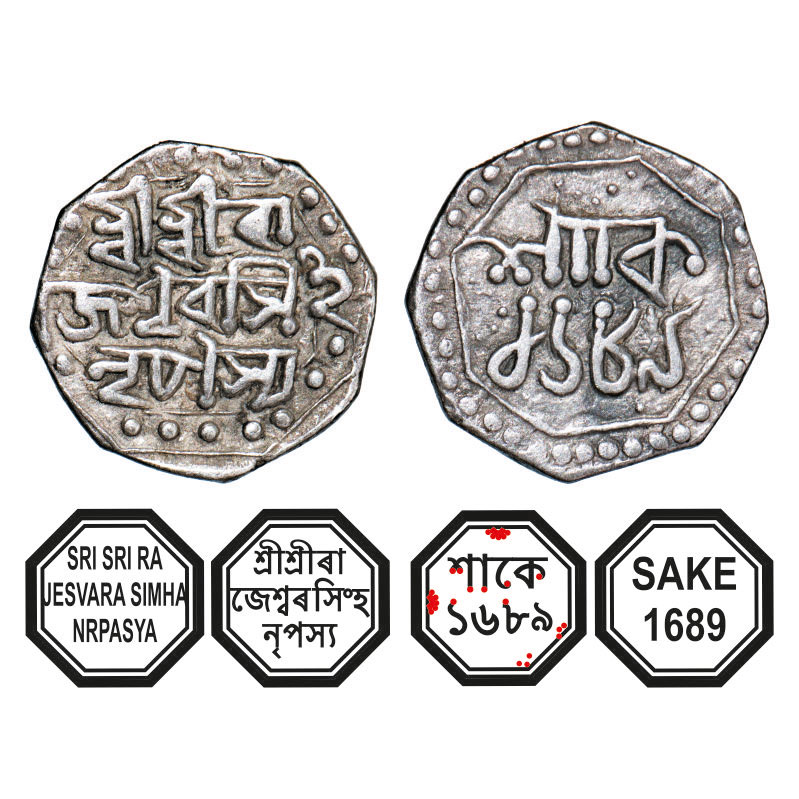 | Assam, Octagonal Silver Quarter Rupee, 2.78g, Rajesvara Simha (Siu-rem-pha) (1751-1769), Sk. 1689, Assamese legends in three lines, Obv: Sri Sri Ra/jesvara Simha/ Nrpasya, Rev: in two lines Sake/ 1689, without crescent above. Reverse die perfectly struck at 6 o'clock. Ex Nichloas Rhodes collection. (A.Mitra. 255, RB. O 74.1). Very Fine, Very Scarce. |