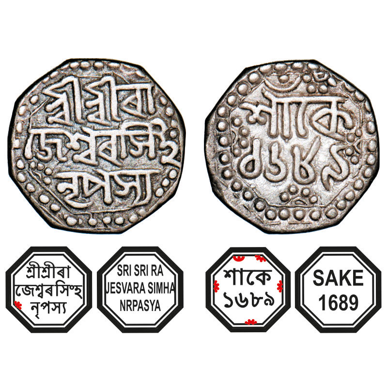 | Assam, Octagonal Silver Quarter Rupee, 2.82g, Rajesvara Simha (Siu-rem-pha) (1751-1769), Sk. 1689, Assamese legends in three lines, Obv: Sri Sri Ra/jesvara Simha/ Nrpasya, Rev: in two lines Sake/ 1689, with crescent above. Reverse die perfectly struck at 6 o'clock. (A.Mitra. 255A unlisted type, RB. O 74.2). About Extremely Fine, Very Scarce. |