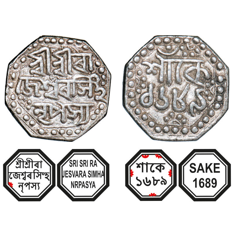 | Assam, Octagonal Silver Quarter Rupee, 2.80g, Rajesvara Simha (Siu-rem-pha) (1751-1769), Sk. 1689, Assamese legends in three lines, Obv: Sri Sri Ra/jesvara Simha/ Nrpasya, Rev: in two lines Sake/ 1689, with crescent above. Reverse die perfectly struck at 6 o'clock. (A.Mitra. 255B unlisted type, RB. O 74.2 type). About Extremely Fine, Very Scarce. |