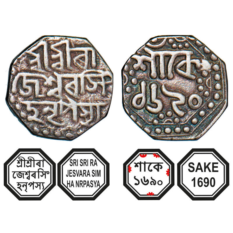 | Assam, Octagonal Silver Quarter Rupee, 2.80g, Rajesvara Simha (Siu-rem-pha) (1751-1769), Sk. 1690, Assamese legends in three lines, Obv: Sri Sri Ra/jesvara Sim/ha Nrpasya, Rev: in two lines Sake/ 1690, with crescent above. Reverse die perfectly struck at 6 o'clock. (A.Mitra. 258, RB. O 76.1). About Extremely Fine, Very Scarce. |