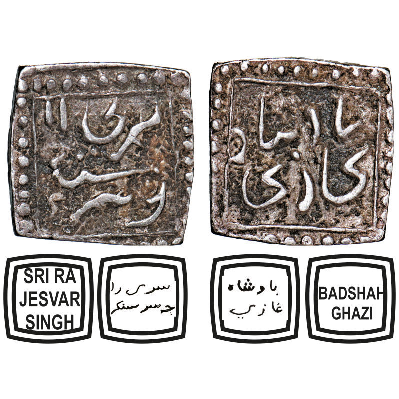 | Assam, Square Silver Quarter Rupee, 2.78g, Rajesvara Simha (Siu-rem-pha) (1751-1769), undated, Persian legends in three lines, Obv: Sri Rajesvar Singh, Rev: in two lines badshah ghazi. Reverse die struck at 9 o'clock. Ex Nichloas Rhodes collection (Ex AHB 1969) collection with pedigree tag. (A.Mitra. 259, RB. O 90.2). Toned About Extremely Fine, Extremely Rare. |