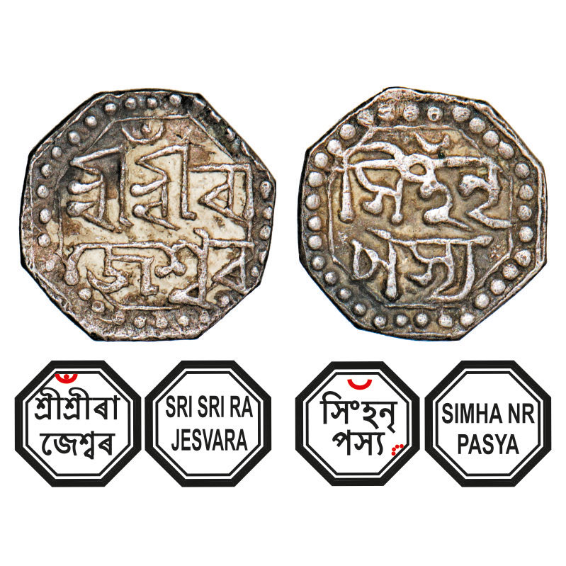 | Assam, Octagonal Silver 1/8 Rupee, 1.42g, Rajesvara Simha (Siu-rem-pha) (1751-1769), undated, Assamese legends in two lines, Obv: Sri Sri Ra/jesvara, dot in crescent on top, Rev: Simha Nr/pasya, crescent on top. Reverse die perfectly struck at 6 o'clock. (A.Mitra. 260A, RB. O 77.1 type). Very Fine, Very Scarce. |