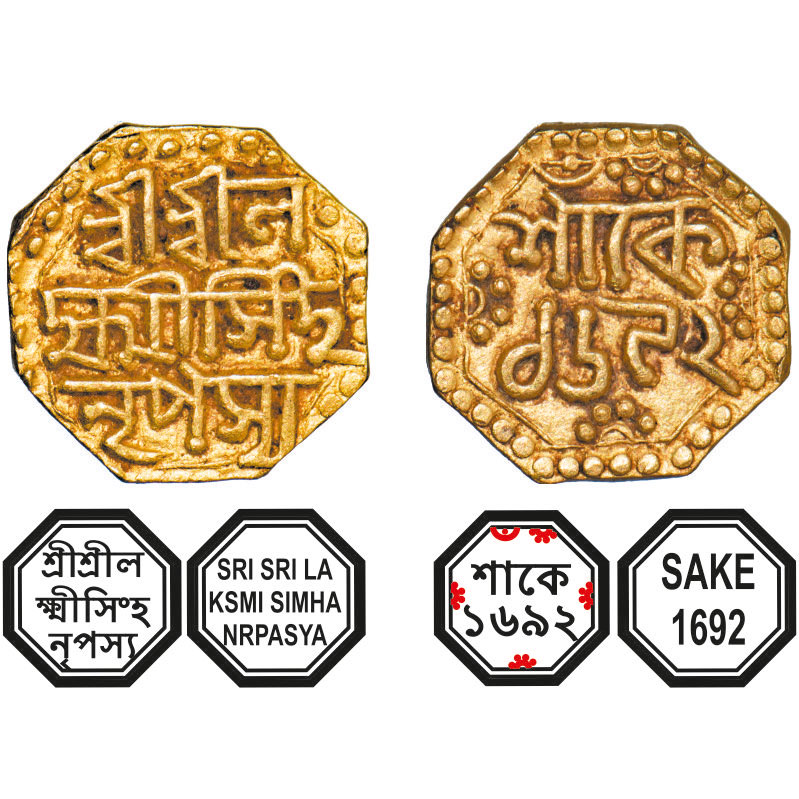 | Assam, Octagonal Gold Quarter Mohur, 2.87g, Lakshmi Simha (1770-80), Sk. 1692, Obv: in three lines, Sri Sri La/ksmi Simha/ Nrpasya, Rev: in two lines Sake/ 1692, with dot in crescent above. Reverse die perfectly struck at 6 o'clock. (A.Mitra. 272, RB. Q 14.1). Extremely Fine, Very Rare. |