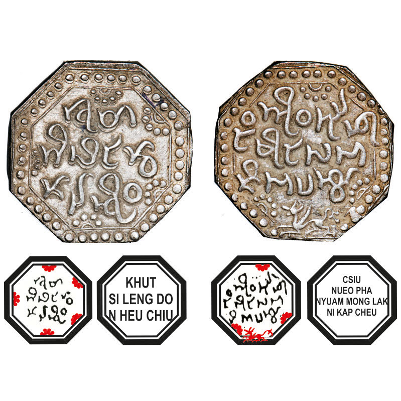 | Assam, Octagonal Silver Rupee, 11.32g, Lakshmi Simha (1770-80), Ahom legends on both sides within a double linear border with beads, dated the first year (of the 60 year cycle), legends within the usual border, Obv: khut/ si Leng-do/n heu chiu, Rev: Csiu-/nyeo-pha/ Nyam-mong lak-/ni Kap-cheu, winged lion below, running left. Reverse die struck at 3 o'clock. (A.Mitra. 281, RB. Q 2.1). Almost Uncirculated, Very Rare. |