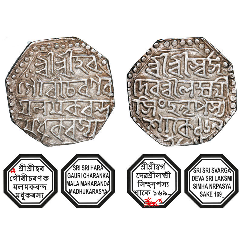 | Assam, Octagonal Silver Rupee (Trial), 10.00g, Lakshmi Simha (1770-80), Sk. 169_(missing digit in die), Assamese legends in four lines, with invocation to Siva and Parvati, Obv: Sri Sri Hara/ Gauri Charanaka/mala Makaranda/ Madhukarasya, Rev: Sri Sri Svarga/ Deva Sri Laksmi/ Simha Nrpasya / Sake 169_, lion running left, below. obverse die of Rajesvara simha with 'charana kamal' type & Unsual die with last digit of date may be missing or shifted down near the lions tail. Reverse die perfectly struck at 6 o'clock. (A.Mitra. Unlisted, RB. Q Unlisted). About Extremely Fine, Extremely Rare. |