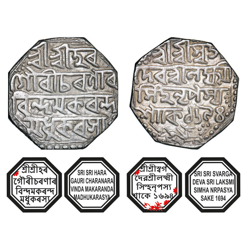 | Assam, Octagonal Silver Rupee, 11.33g, Lakshmi Simha (1770-80), Sk. 1694, Assamese legends in four lines, with invocation to Siva and Parvati, Obv: Sri Sri Hara/ Gauri Charanara/vinda Makaranda/ Madhukarasya, Rev: Sri Sri Svarga/ Deva Sri Laksmi/ Simha Nrpasya / Sake 1694, lion running right, below. Reverse die perfectly struck at 6 o'clock. (A.Mitra. 287, RB. Q 27.2 type). Very Fine+, Scarce. |