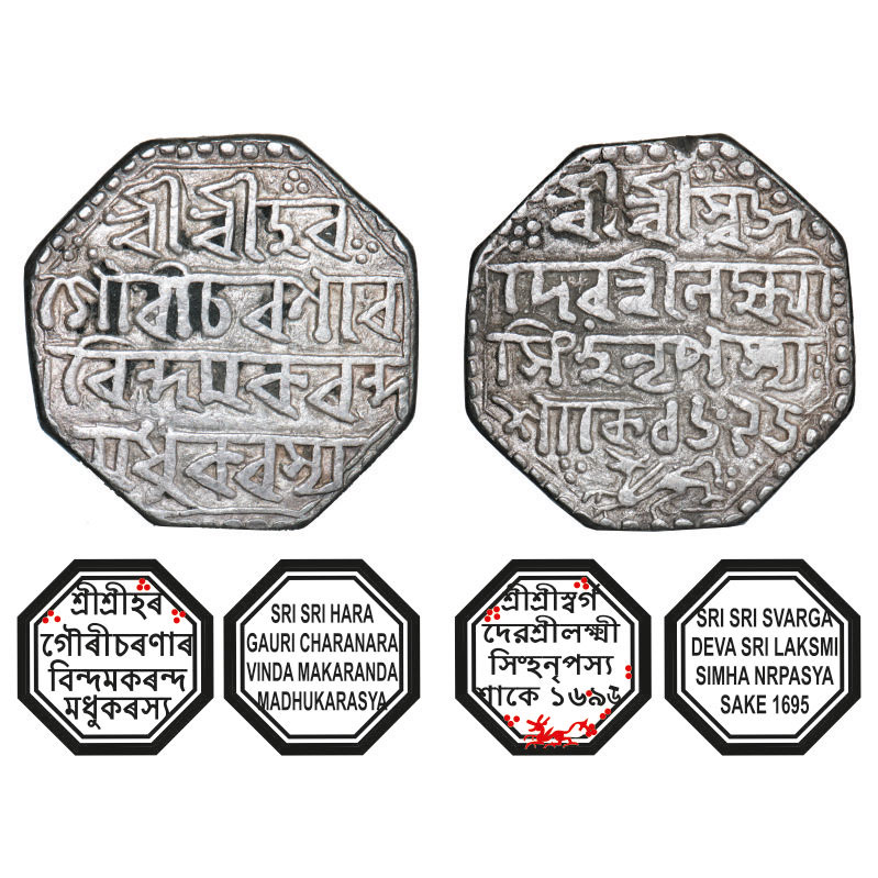| Assam, Octagonal Silver Rupee, 10.98g, Lakshmi Simha (1770-80), Sk. 1695, Assamese legends in four lines, with invocation to Siva and Parvati, Obv: Sri Sri Hara/ Gauri Charanara/vinda Makaranda/ Madhukarasya, Rev: Sri Sri Svarga/ Deva Sri Laksmi/ Simha Nrpasya / Sake 1695, lion running left, below. Reverse die perfectly struck at 6 o'clock. (A.Mitra. Unlisted, RB. Q Unlisted). Edge nick, Very Fine, Rare. |