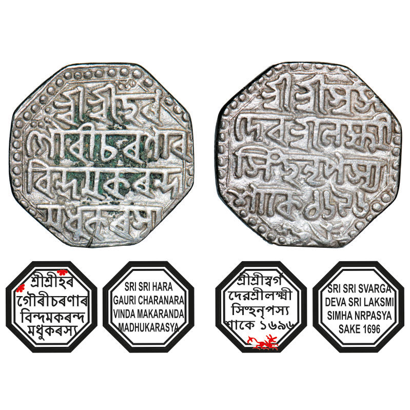 | Assam, Octagonal Silver Rupee, 8.02g (low weight), Lakshmi Simha (1770-80), Sk. 1696, Assamese legends in four lines, with invocation to Siva and Parvati, Obv: Sri Sri Hara/ Gauri Charanara/vinda Makaranda/ Madhukarasya, Rev: Sri Sri Svarga/ Deva Sri Laksmi/ Simha Nrpasya / Sake 1696, lion running right, below. Reverse die perfectly struck at 6 o'clock. (A.Mitra. 289 type, RB. Q 29.1 type). Very Fine, Very Scarce. |