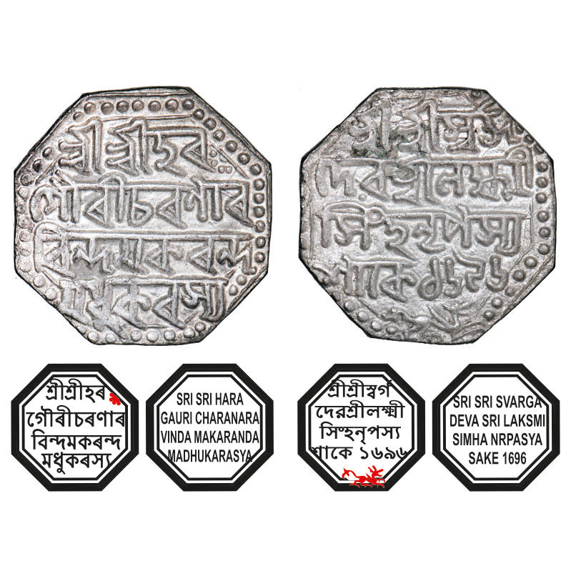 | Assam, Octagonal Silver Rupee, 11.32g, Lakshmi Simha (1770-80), Sk. 1696, Assamese legends in four lines, with invocation to Siva and Parvati, Obv: Sri Sri Hara/ Gauri Charanara/vinda Makaranda/ Madhukarasya, Rev: Sri Sri Svarga/ Deva Sri Laksmi/ Simha Nrpasya / Sake 1696, lion running right, below. Reverse die perfectly struck at 6 o'clock. (A.Mitra. 289, RB. Q 29.3). Extremely Fine+, Scarce. |