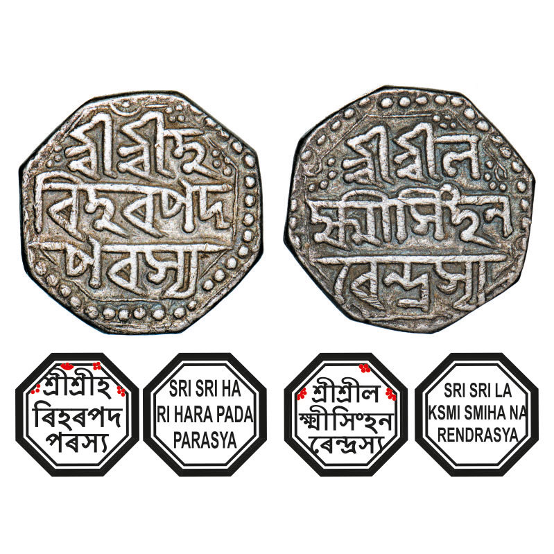 | Assam, Octagonal Silver Half Rupee, 5.62g, Lakshmi Simha (1770-80), undated, Assamese legends in three lines, with invocation to Siva, Obv: Sri Sri Ha/ri Hara Pada/ Parasya, with dot in crescent on top, Rev: Sri Sri La/ksmi Simha Na/ rendrasya. Reverse die perfectly struck at 6 o'clock. (A.Mitra. 295, RB. Q 35.1 type). About Very Fine, Rare. |
