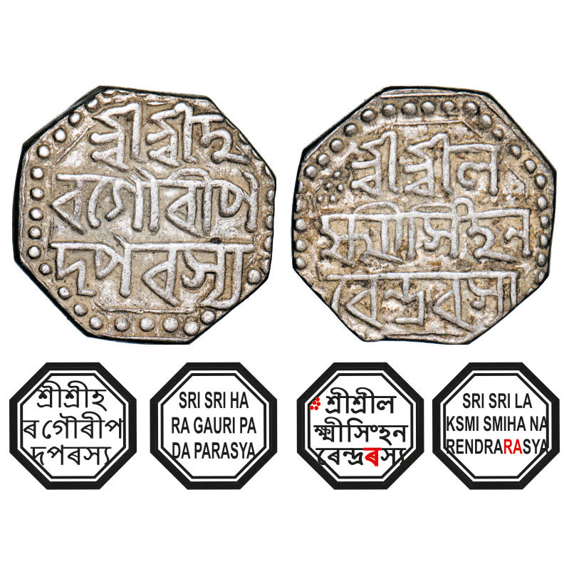 | Assam, Octagonal Silver Half Rupee, 5.68g, Lakshmi Simha (1770-80), undated, Assamese legends in three lines, with invocation to Siva & Parvati, Obv: Sri Sri Ha/ra Gauri Pa/da Parasya, Rev: Sri Sri La/ksmi Simha Na/ rendra rasya. Reverse die perfectly struck at 6 o'clock. (A.Mitra. 297, RB. Q 37.2 type). Very Fine, Scarce. |