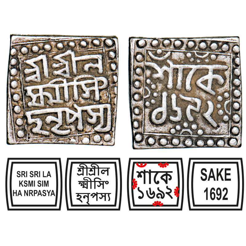 | Assam, Square Silver Quarter Rupee, 2.83g, Lakshmi Simha (1770-80), Sk. 1692, Assamese legends in three lines, Obv: Sri Sri La/ksmi Sim/ha Nrpasya, Rev: in two lines, Sake/ 1692, with dot in crescent on top. Reverse die perfectly struck at 6 o'clock. Ex Nicholas Rhodes Collection. (A.Mitra. 304, RB. Q 45.1). Very Fine+, Extremely Rare. |
