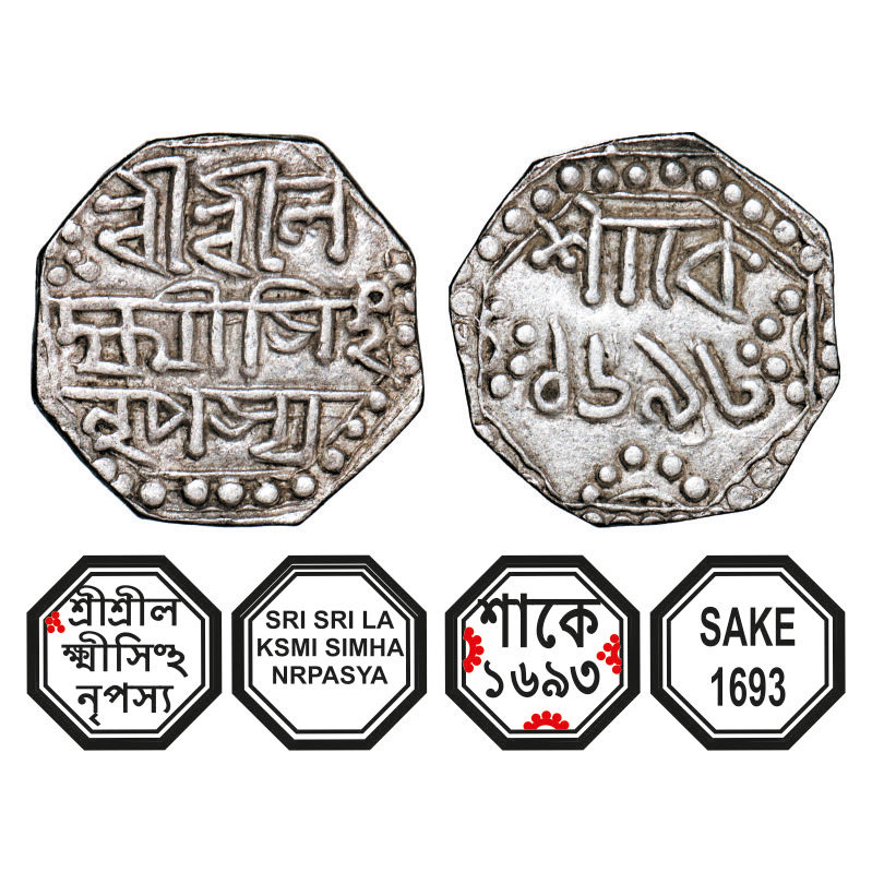 | Assam, Octagonal Silver Quarter Rupee, 2.00g ((Contemporary low weight, country made later issue), Lakshmi Simha (1770-80), Sk. 1693, Assamese legends in three lines, Obv: Sri Sri La/ksmi Simha/ Nrpasya, (no line over Ha), Rev: in two lines, Sake/ 1693, (fine type legends), without crescent on top. Reverse die perfectly struck at 6 o'clock. Offered for die study and research purpose only. (A.Mitra. 306b, RB. Q unlisted type). Extremely Fine, Scarce. |